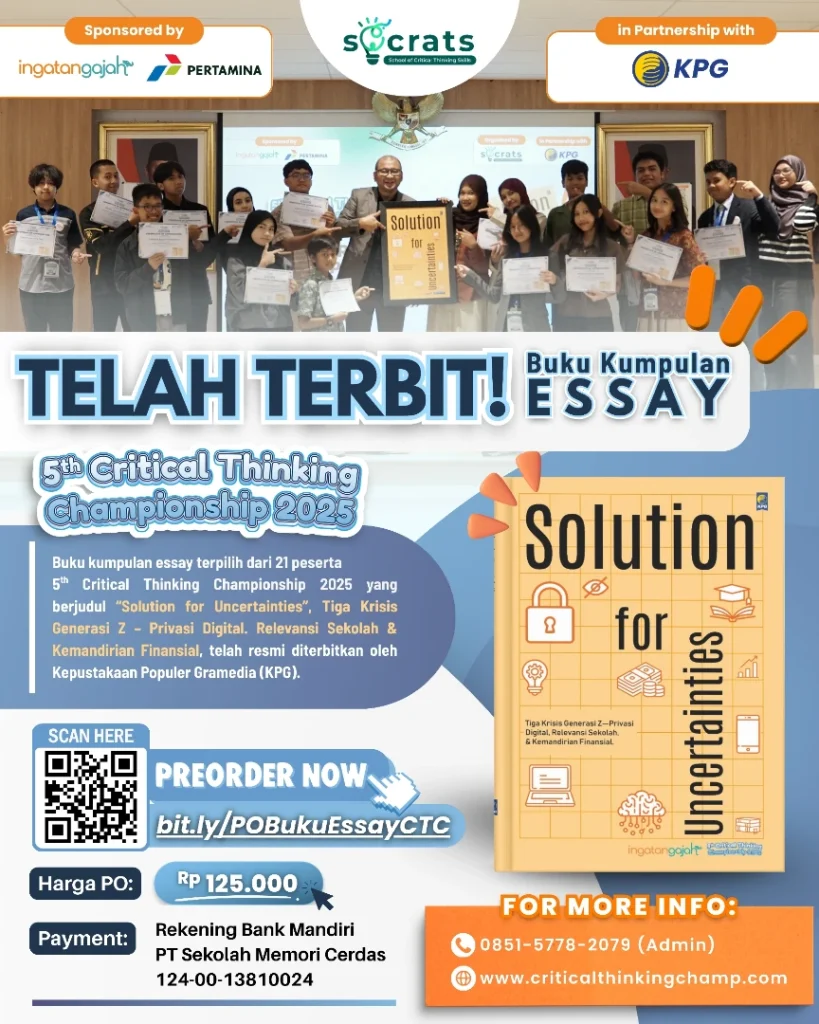 Buku yang berjudul “Solution for Uncertainties” Tiga Krisis Generasi Z – Privasi Digital. Relevansi Sekolah & Kemandirian Finansial, ini berisi 21 esai inspiratif karya peserta yang telah terpilih, buku ini akan mengupas tuntas tiap isu-isu terkini seperti Ancaman Privasi dari AI (Artificial Intelligence), Lieterasi Finansial, hingga Sistem Pendidikan. Melalui buku ini, para peserta berhasil menunjukkan kemampuan berpikir kritis luar biasa dalam menghadapi berbagai ketidakpastian dunia. 🌍💡